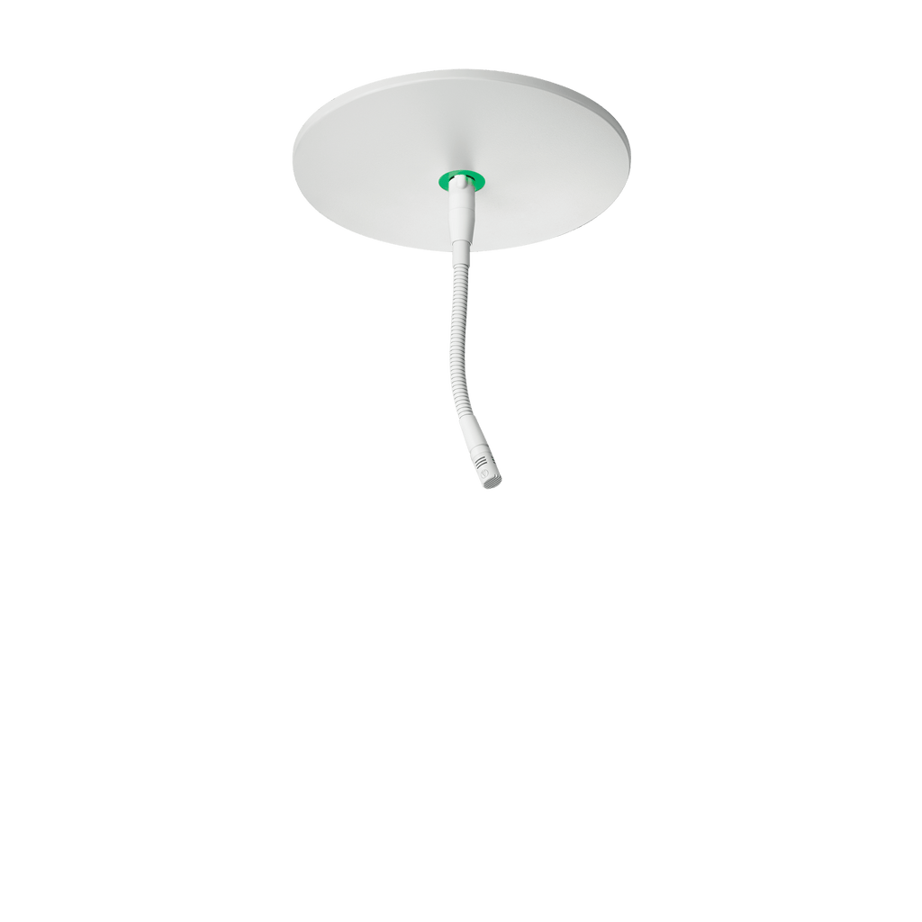 Miniature cardioid condenser gooseneck microphone (6" long), includes Dante-enabled wall/ceiling plate power module, support for Dante Domain Manager and Dante AES67 mode, foam windscreen and steel hanger, white