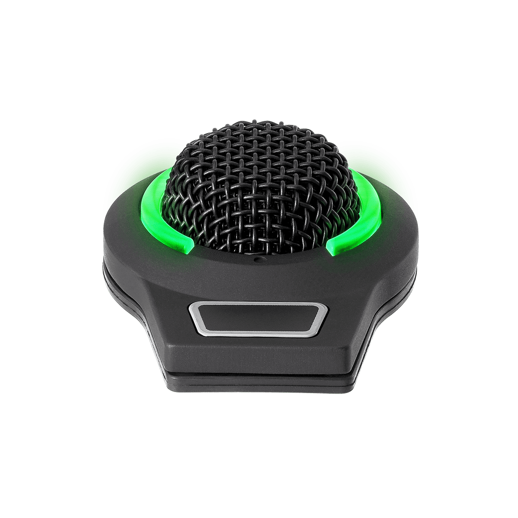 Cardioid condenser boundary microphone with self-contained power module, RGB LED ring (7 selectable colors + OFF) indicates mute status, Logic I/O, phantom power only, 5-pin, black